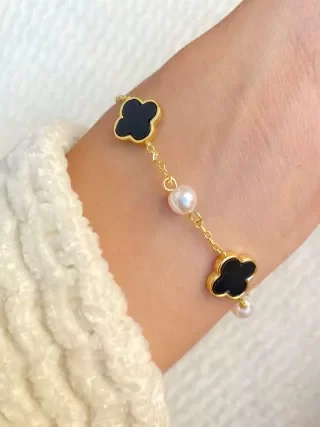 💚 Pulsera de acero blanco con tréboles y perlas. Amuleto de buena suerte con onda.