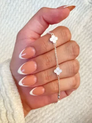 🌸 Pulsera de acero blanco con tréboles y detalles nácar. Femenina, delicada y encantadora.